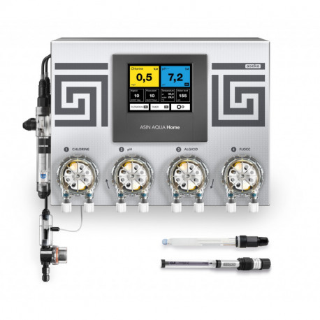 ASIN Aqua HOME CLF VS je dávkovací a řídící automat vybavený modulem pro řízení pumpy s variabilním výkonem, sondou CLF pro měření volného chloru a sondou pH.