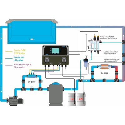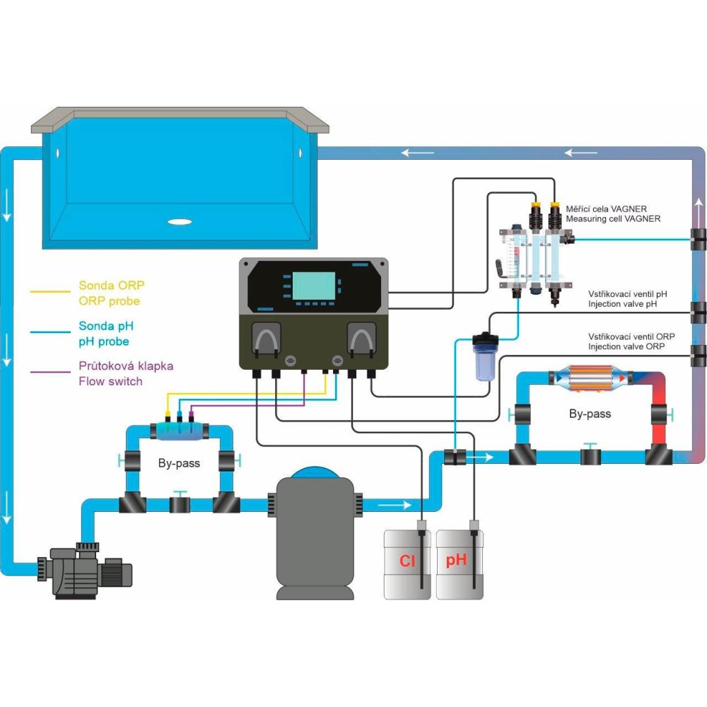Schematický příklad hydraulického zapojení stanice VA DOS BASIC EXACT "VAGNER" - pH + FCL