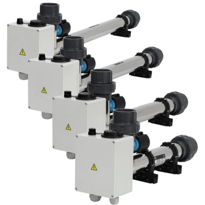 Elektrické průtokové ohřívače jsou určeny k ohřevu vody v bazénech a vířivých vanách, činnost spočívá v ohřevu protékající vody tělesem topení, teplota ohřívané vody je nastavena regulačním termostatem. Topné těleso je spínáno stykačem, který je ovládán výše uvedeným termostatem a bezpečnostním indikátorem průtoku. Z tohoto důvodu je k topení nutná tzv. velká automatika - 24 hodinový programátor filtrace, proudový chránič (ochrana před nebezpečným dotykovým napětím), tepelná ochrana motoru, stykač a spínač topení.