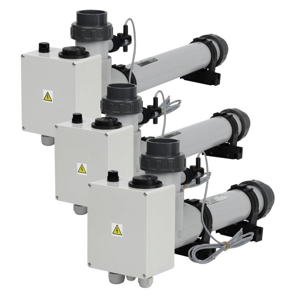Elektrické průtokové ohřívače jsou určeny k ohřevu vody v bazénech a vířivých vanách, činnost spočívá v ohřevu protékající vody tělesem topení, teplota ohřívané vody je nastavena regulačním termostatem. Topné těleso je spínáno stykačem, který je ovládán výše uvedeným termostatem, bezpečnostním indikátorem průtoku. Z tohoto důvodu je k topení nutná tzv. velká automatika - 24 hodinový programátor filtrace, proudový chránič (ochrana před nebezpečným dotykovým napětím), tepelná ochrana motoru, stykač a spínač topení.