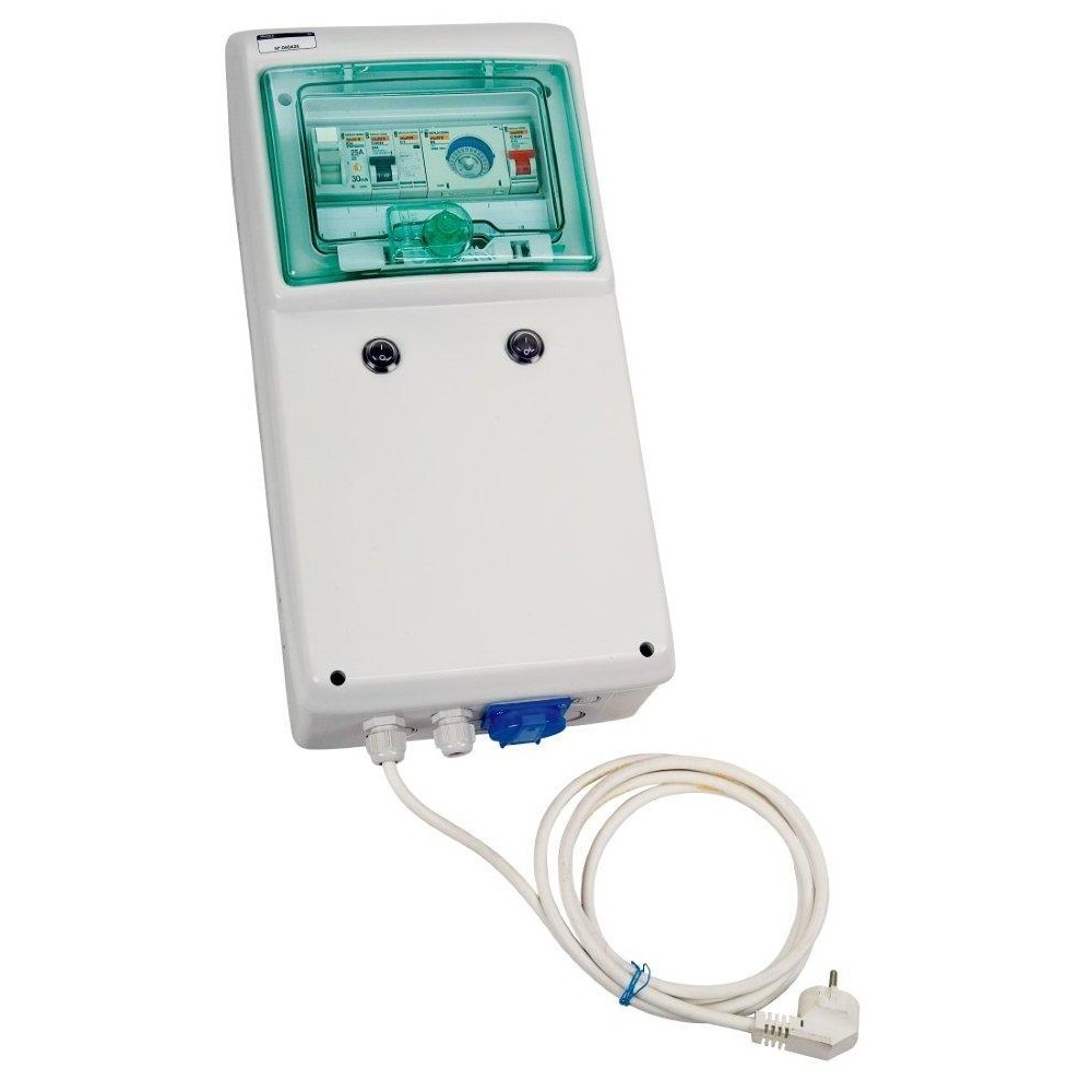 Automatické elektrické ovládací systémy bazénové technologie. F1 s flexo-kabelem - Jednoduchá montáž, bez zásahu do vnitřního zapojení. Připojíte pouze zástrčku filtrace do zásuvky a zástrčku automatiky do zásuvky přivedené pro bazén. Automatika je vybavena proudovým chráničem 30 mA, jištěním motoru filtrace, spínacími hodinami pro časové spínaní doby filtrování, transformátorem 300W. Na přední straně rozvaděče je spínač pro okamžité zapnutí filtrování, například při vysávaní, a spínač světel.