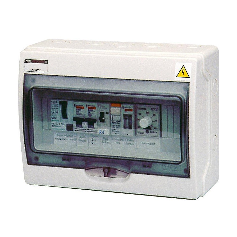 Automatické ovládání pro filtraci a výměníkový ohřev - zařízení obsahuje proudový chránič 30 mA, přepínač -- autom./ruční režim chodu filtrace, spínací hodiny, jištění filtrace, elektronický termostat se signálkou včetně teplotního čidla , jištění a spínání oběhového čerpadla nebo el. ventilu nebo plynového kotle. Nastavení požadované teploty bazénové vody přímo v rozvaděči.