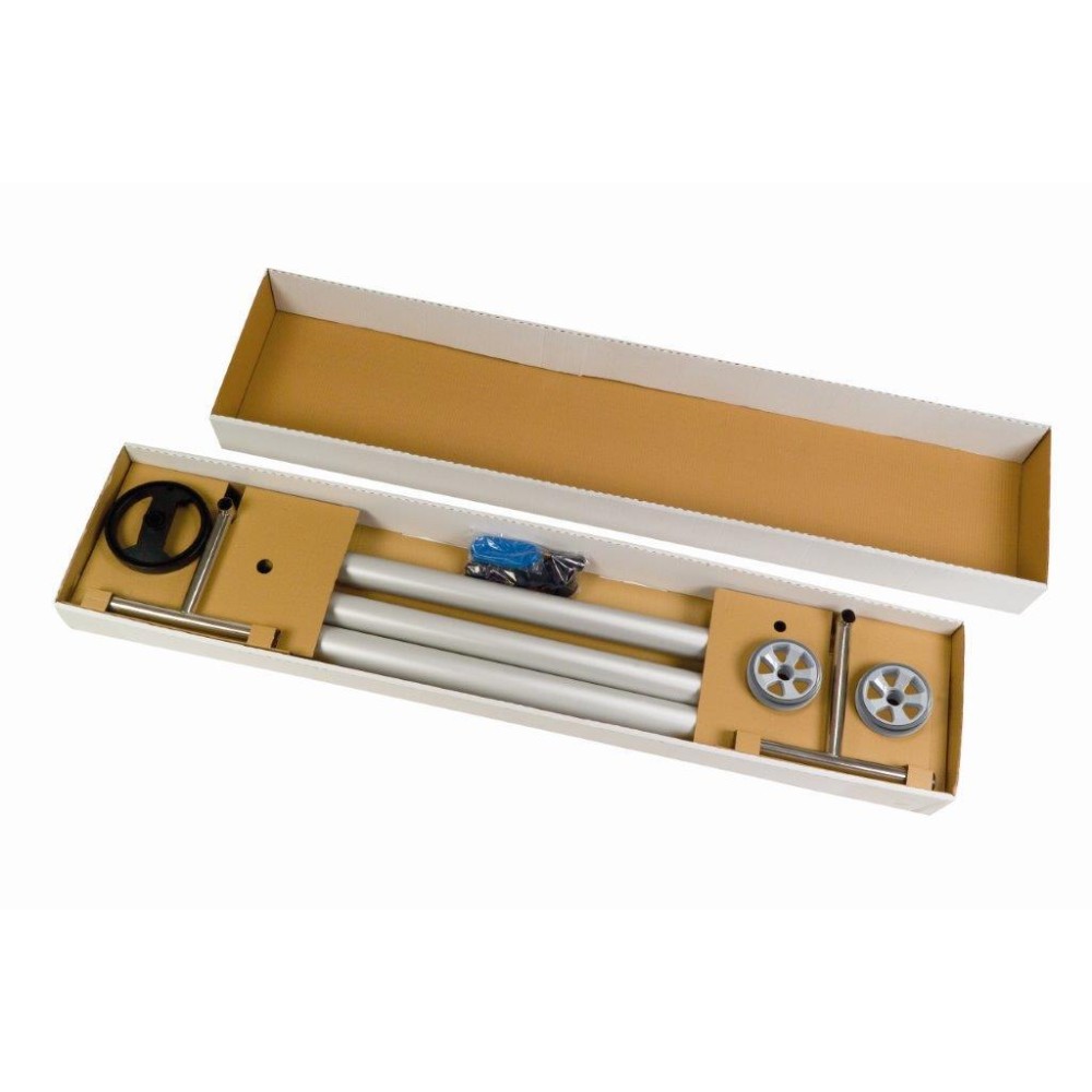 Krabice s pojízdným navíjecím zařízením „sestav si sám“ obsahuje hliníkovou eloxovanou teleskopickou tyč skládající se vždy zetří dílů, nerezové stojny + komponenty potřebné pro sestavení kompletního zařízení. Součástí jsou veškeré úchyty a tkalouny pro solární plachtu.