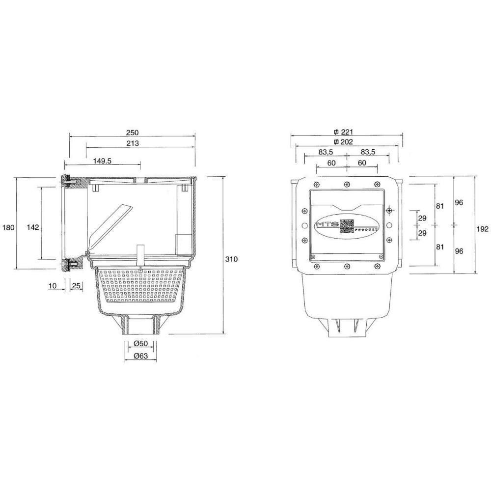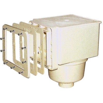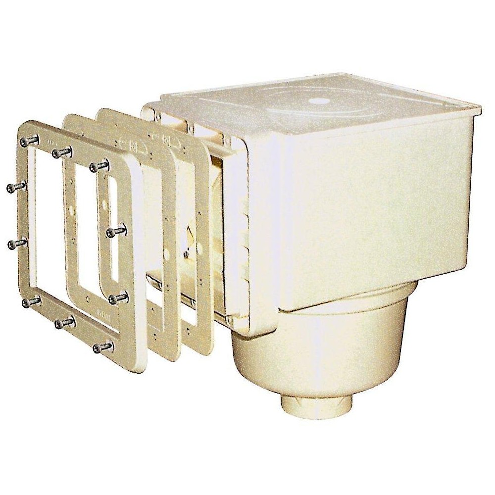Malý skimmer značky MTS s kapacitou "širokého skimmeru", úprava výšky hladiny, 32 mm přepad, mosazné zástřiky 10x M6, napojení lepením o průměru 50 nebo 63 mm