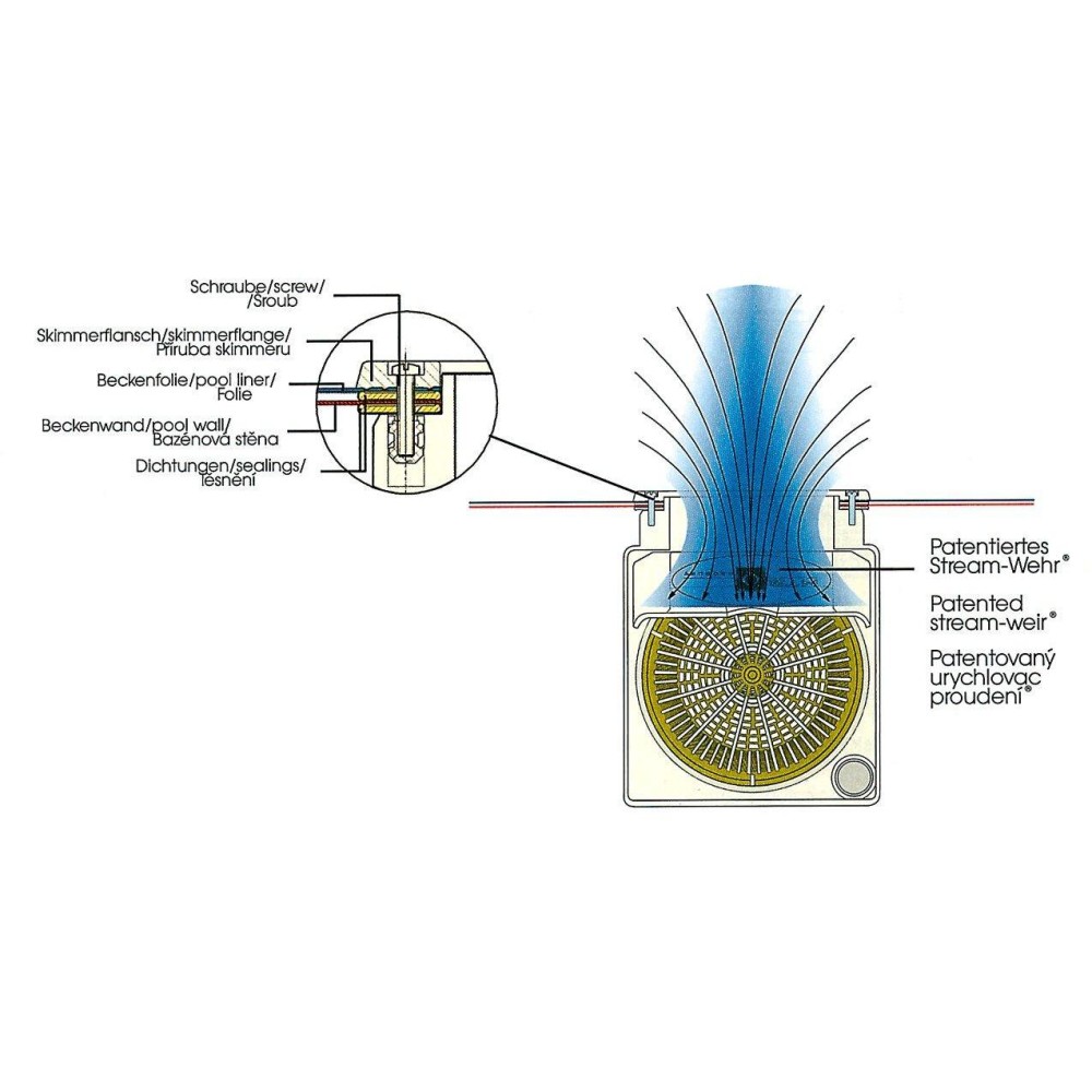 Skimmer (hladinový sběrač nečistot) slouží k odvodu znečištěné bazénové vody do filtrace. Skimmer je plastová či nerezová nádoba zabudovaná ve stěně bazénu, nebo volně zavěšená na stěně (u nadzemních bazénů). Typ skimmeru se určí dle konstrukce bazénu.