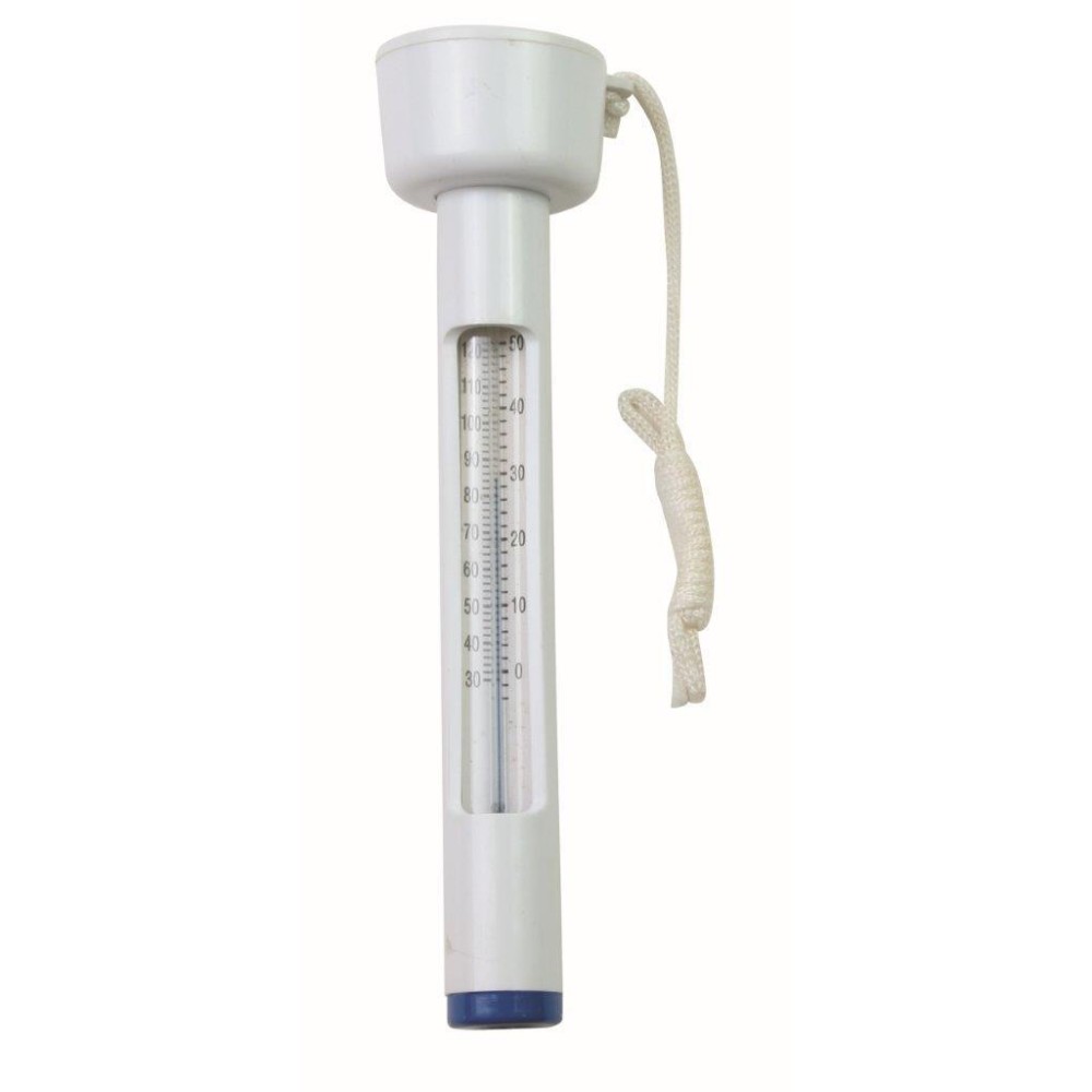 Plovoucí teploměr, slouží k měření teploty bazénové vody, doplněn provázkem k upevnění např. ke schůdkům