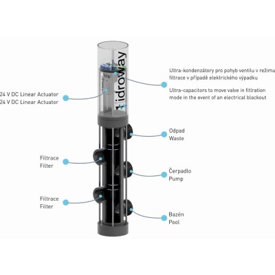 - V případě výpadku proudu se ventil automaticky přepne do režimu filtrace